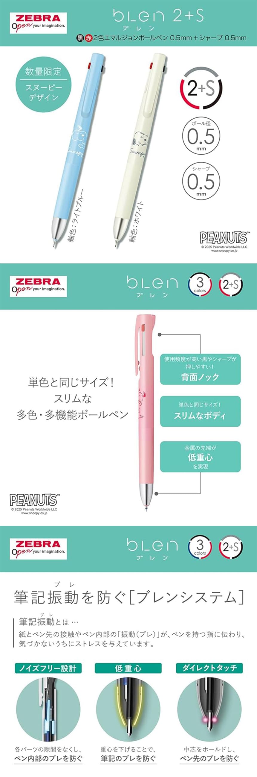 「ブレン」は筆記時に生じる振動を制御したブレないボールペンです。独自開発の機構によって、従来品では筆記時に紙とペン先が接触すると発生していた振動(ブレ)を制御することで、「ストレスフリーな書き心地」を実現しました。数量限定スヌーピーデザイン。黒・赤のボールペンとシャープペンが1本になっています。