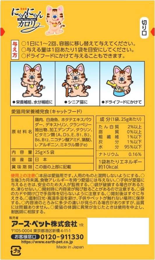 [24個]アース・ペット にゃんにゃんカロリー ほたて風味 25g×5袋 | やさしい流動食。健康に配慮した成分配合。下部尿路の健康維持にも配慮。国産。