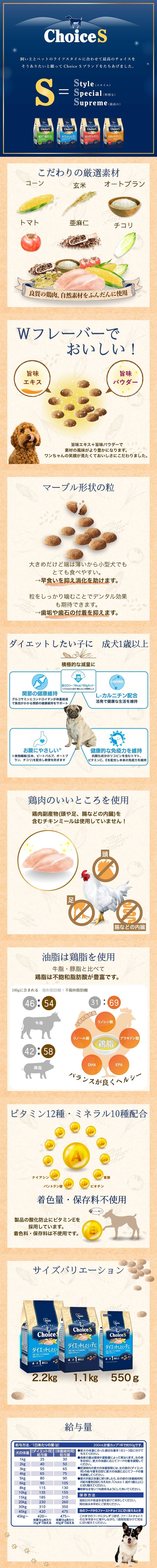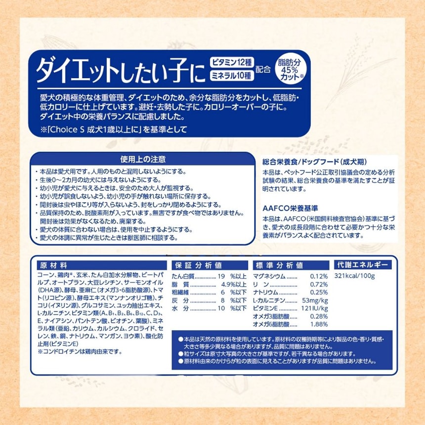 ●愛犬の体重管理、ダイエットのため、余分な脂肪分をカットし、低脂肪・低カロリーに仕上げています(「Choice S成犬1歳以上に」を基準として脂肪分45%カット、低カロリー19kcal/100gカット)。