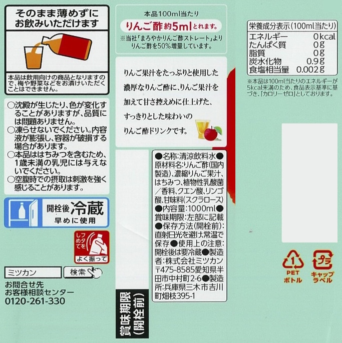 りんご酢50%増量(まろやかりんご酢ストレート比)、植物性乳酸菌入り、カロリーゼロです。