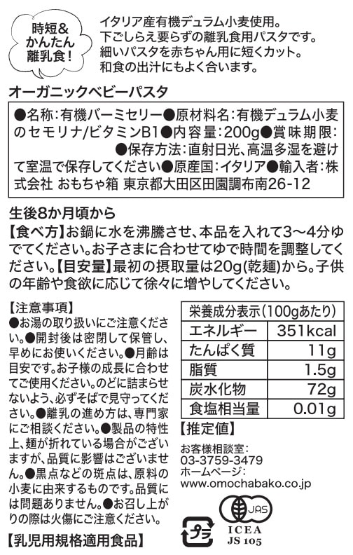 [12個]おもちゃ箱 オーガニックベビーパスタ 200g | イタリア産オーガニックデュラムセモリナ小麦を100%使用。