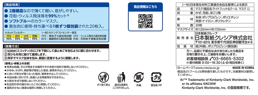 [計400枚]日本製紙クレシア スコッティ ライトフィットクールマスク ブルー Lサイズ 20枚入×20個 | 快適な着けごこちの不織布マスク。個包装。Lサイズ20枚入り。EC限定。