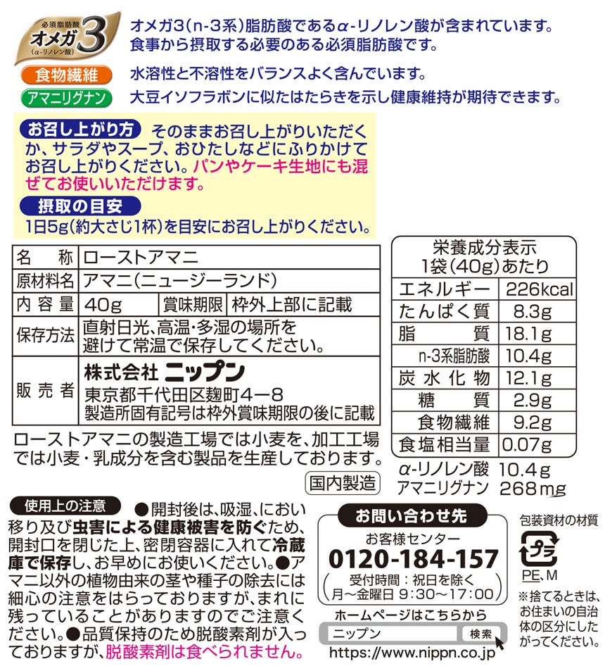 [48袋]ニップン ローストアマニ粒 40g | アマニを香ばしくローストしました。ゴールデン種100%