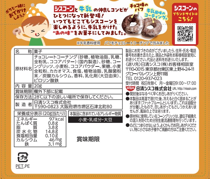 [36個]日清シスコ おでかけシスコーン サクサクリング チョコミルク味 20g | チョコ味パフに牛乳風味のコーティングをしたリング形のお菓子