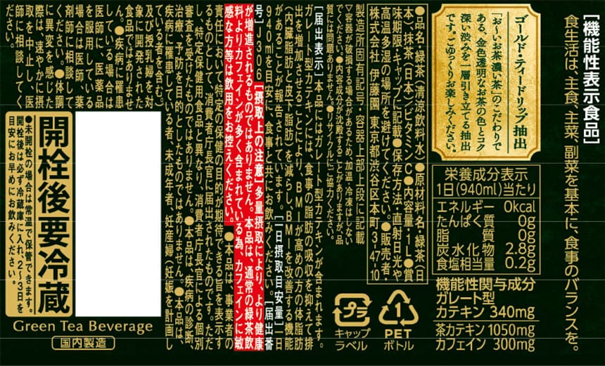 ■摂取上の注意:多量摂取により、より健康が増進されるものではありません。本品は、通常の緑茶飲料よりカフェインが多く含まれている為、カフェインに敏感な方等は飲用をお控えください。
