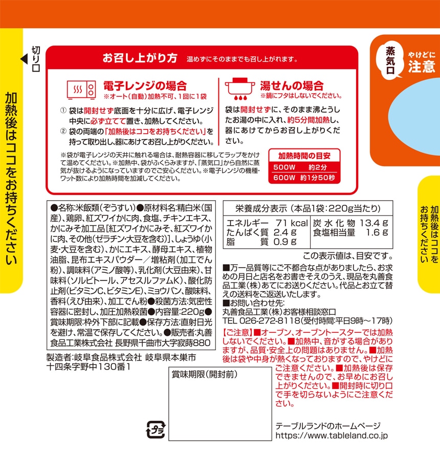 封を切らずに袋を立てたまま、電子レンジで温めるだけで、簡単美味しいかに雑炊がお召し上がり頂けます。