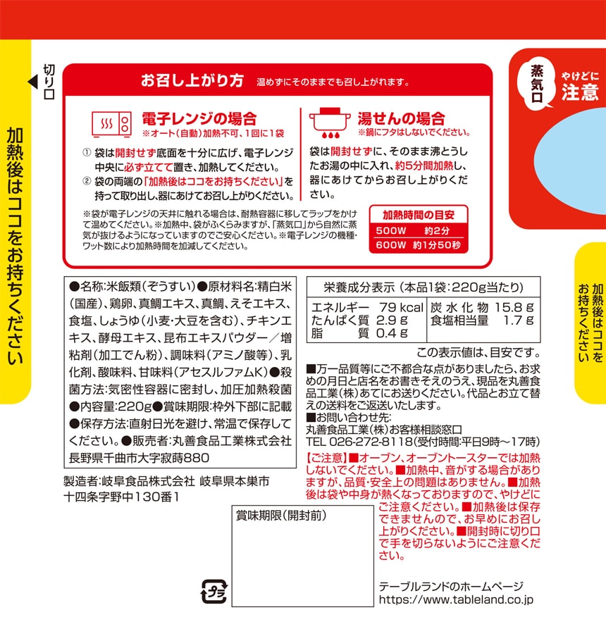 封を切らずに袋を立てたまま、電子レンジで温めるだけで、簡単美味しいたい雑炊がお召し上がり頂けます。