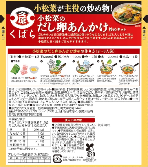 [48袋]久原醬油 小松菜のだし卵あんかけ炒めキット 59.5g | だしのきいた甘口醤油味に胡麻油の香りがクセになります。