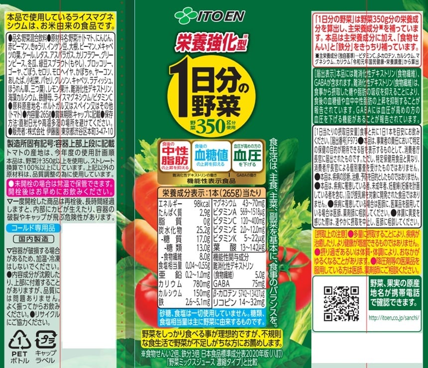 [24本]【機能性表示食品】伊藤園 栄養強化型 1日分の野菜 PET 265g | 「1日分の野菜」ブランドから、野菜の栄養もしっかり摂れる初の機能性表示食品が登場。