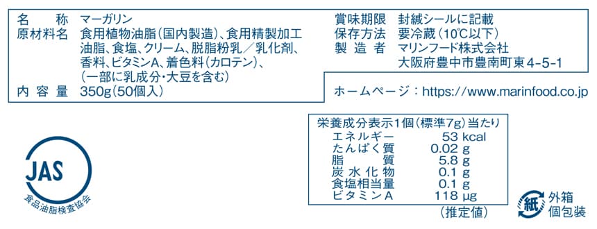 [20箱]マリンフード キューブマーガリン 350g(50個入) | 量目を抑えた使い切りサイズ・簡易包装のマーガリン
