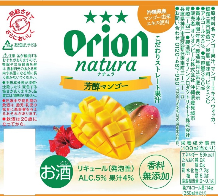 [72本]オリオンビール natura 芳醇マンゴー 350ml | マンゴー特有の濃厚な甘さと、芳醇な香りが楽しめる味わいです。