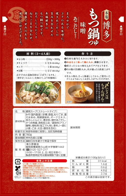まろやかでコクのある味噌に、焼きあごだしの旨みを合わせた本場博多のもつ鍋つゆです。