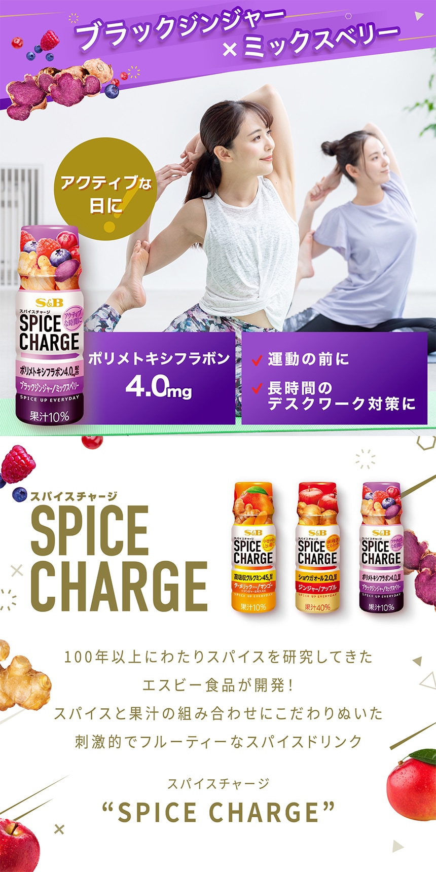 [20本]エスビー食品 スパイスチャージ ブラックジンジャー/ミックスベリー 50ml | スパイスと果汁の組み合わせにこだわりぬいたブラックジンジャーのスパイスドリンク