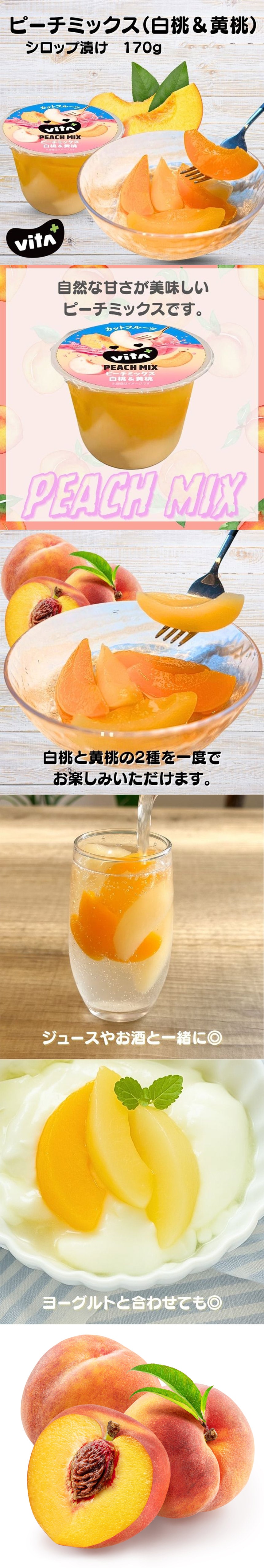 【ビタプラス ピーチミックス】黄桃、白桃、砂糖、濃縮レモン果汁/酸化防止剤(ビタミンC)、酸味料、ピーチ香料
