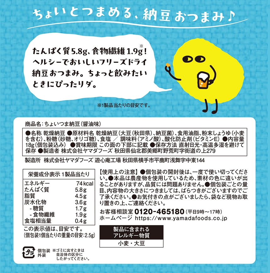 [40袋]ヤマダフーズ ちょいつま納豆(醤油味) 18g(個包装込み) | 納豆を丸ごとフリーズドライした、ちょいとつまめるさくカリ食感のノンフライ納豆スナックです。