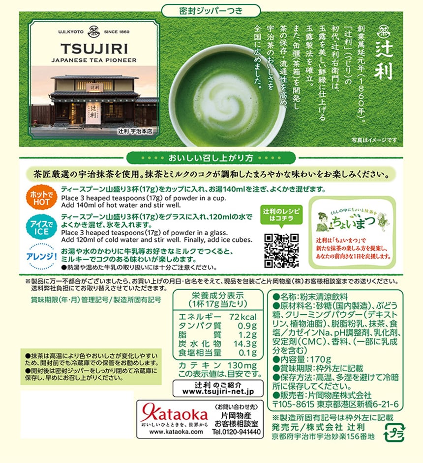 片岡物産 辻利 抹茶ミルク 170g×12袋 | 茶匠厳選の宇治抹茶を使用。