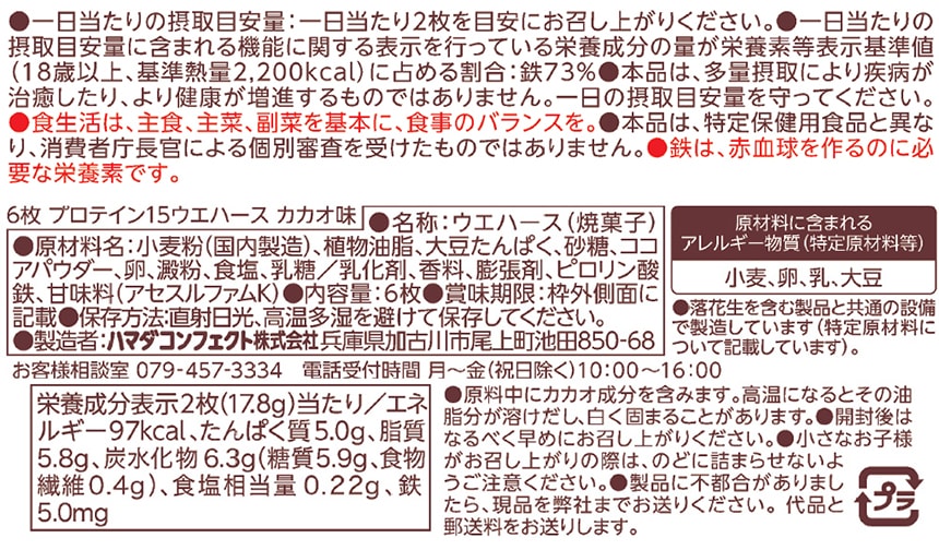 - ハマダコンフェクト プロテイン15ウエハース(カカオ味) 6枚×20袋