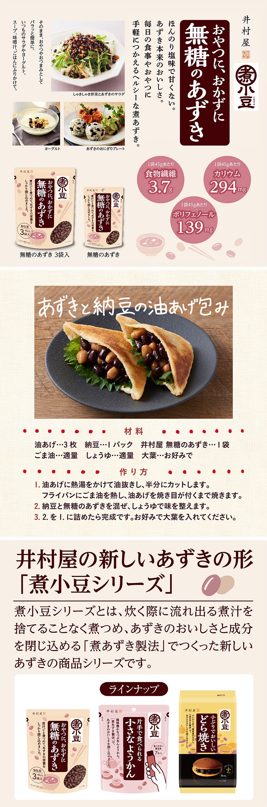 小豆を炊く際に流れ出る煮汁を捨てることなく煮詰め小豆のおいしさと成分を閉じ込める「煮あずき製法」でつくりました。
