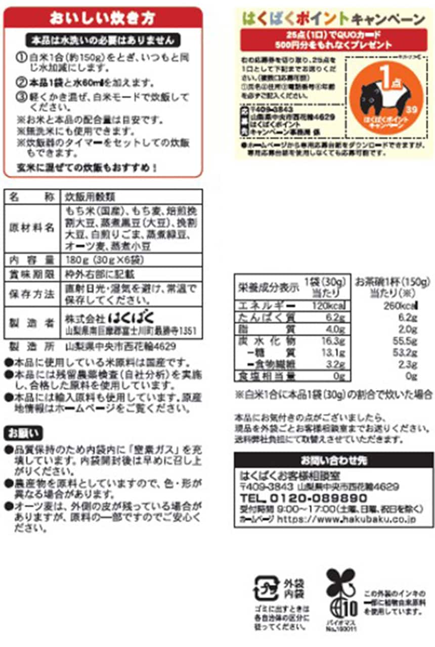 - はくばく たんぱく質が摂れるお豆ブレンド雑穀 180g (30g×6袋入)×3袋