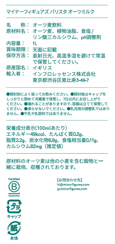 - マイナーフィギュアズ バリスタ オーツミルク 1000ml×6本