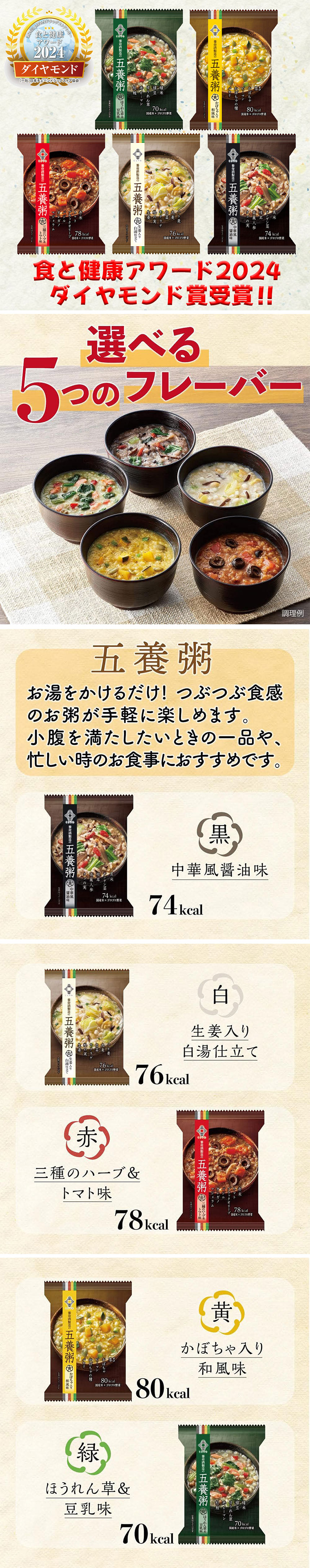 【シリーズ全体の特徴】養命酒製造オリジナルレシピの健康粥です。フリーズドライで約1分のカンタン調理。お手軽ながらもつぶつぶ素材とゴロゴロ野菜の食べごたえ。時短でもおいしく食事したい方や趣味に時間を費やすアクティブシニアにおすすめ。小腹が空いたときの夜食や飲みの〆にも最適。一食当たり70~80kcal(フレーバーにより異なります)なのでカロリーコントロールにもお役立ていただけます。