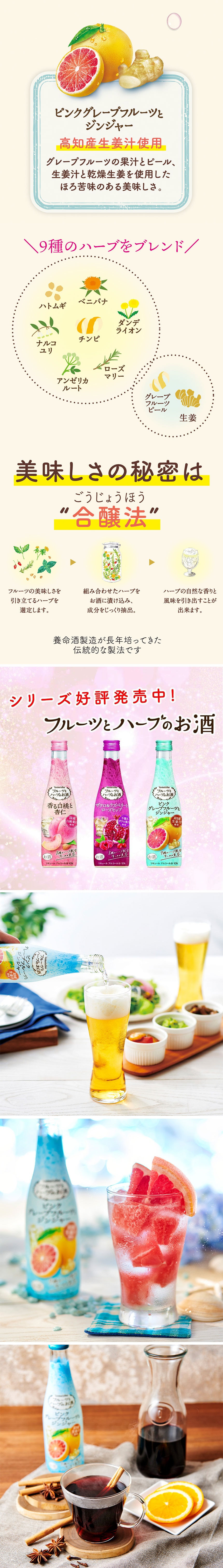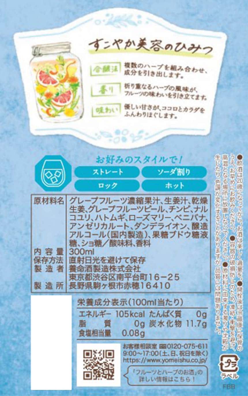 こだわりの果汁を使用し「フルーツ」らしい香りや味わいに磨きをかけました。【ココロとカラダにうれしい】 女性にうれしい7種のハーブ(チンピ・ナルコユリ・ハトムギ・ローズマリー・ベニバナ・アンゼリカルート・ダンデライオン)に加え2つのジンジャー(生姜汁乾燥生姜)とグレープフルーツピールを配合。2つのグレープフルーツ(果汁ピール)を使用し丸ごと果実をかじったような果実感が特徴です。ピンクグレープフルーツのほろ苦く甘酸っぱい美味しさにジンジャーがアクセントとなった爽やかな味わいです。【製法へのこだわり】養命酒製造の製品づくりの原点でもあるハーブの知見信州駒ヶ根高原の豊かな自然環境そして長年培ってきた複数のハーブをまとめてお酒に漬け込んで成分を引き出す"合醸法"がそのまま生きています。