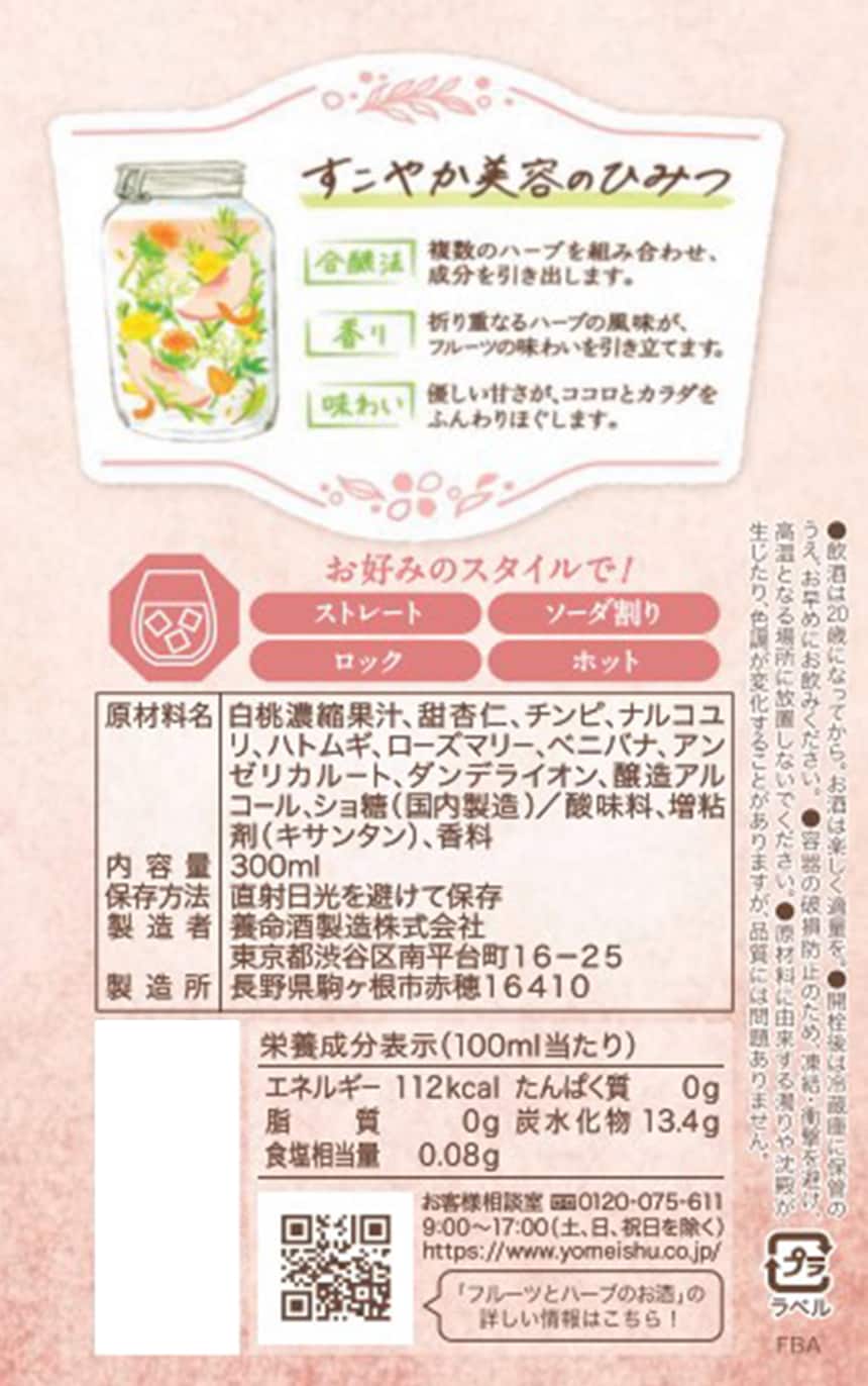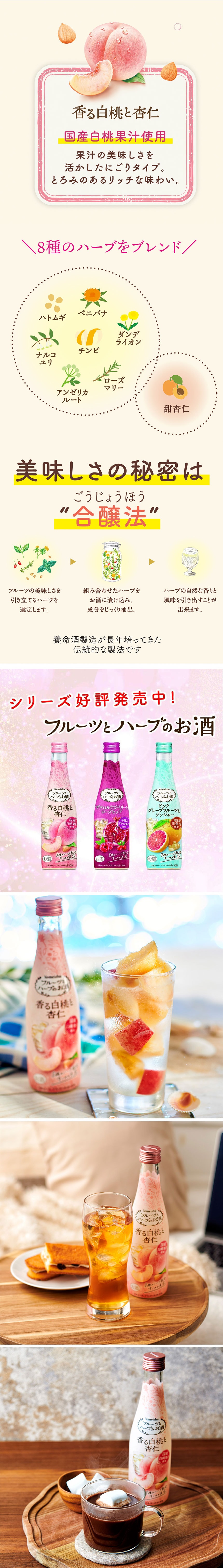 こだわりの果汁を使用し「フルーツ」らしい香りや味わいにこだわりました。【ココロとカラダにうれしい】 女性にうれしい7種のハーブ(チンピ・ナルコユリ・ハトムギ・ローズマリー・ベニバナ・アンゼリカルート・ダンデライオン)に加え甜杏仁を配合。白桃の香りがふわりと甘く香り立ちやわらかさとリッチさを感じる豊かな味わいが特徴です。国産白桃果汁の美味しさを杏仁が引き立てるとろけるような味わいに仕上げています。【製法へのこだわり】養命酒製造の製品づくりの原点でもあるハーブの知見信州駒ヶ根高原の豊かな自然環境そして長年培ってきた複数のハーブをまとめてお酒に漬け込んで成分を引き出す"合醸法"がそのまま生きています。