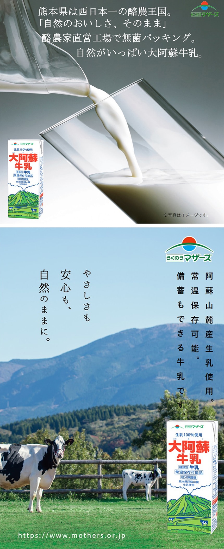 熊本県は西日本1位(全国3位)の生乳の生産量を誇る酪農王国です。その中でも水がきれいで自然が豊かな阿蘇山麓地域に生乳の産地を指定し、酪農家直営工場で無菌パッキングしています。