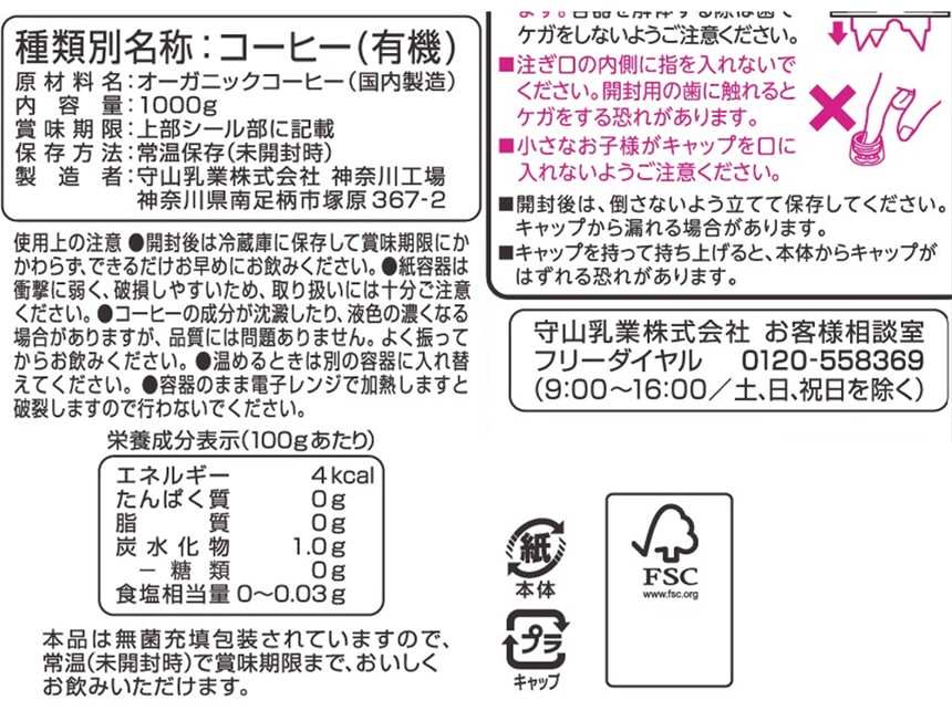 - 守山乳業 喫茶店の味 オーガニック珈琲 1000g×3本