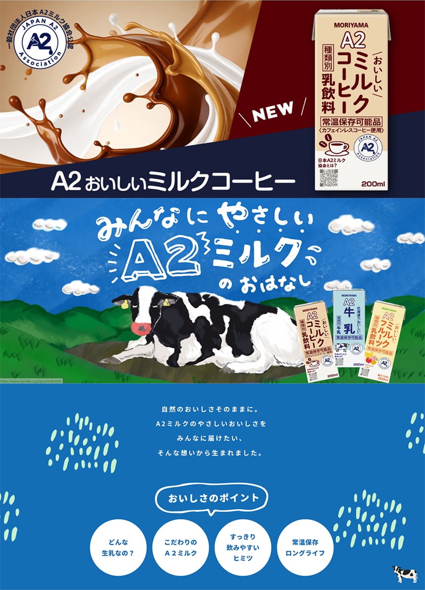 北海道産A2生乳使用。コーヒーはカフェインレス豆使用のやさしい味わいのミルクコーヒーです。