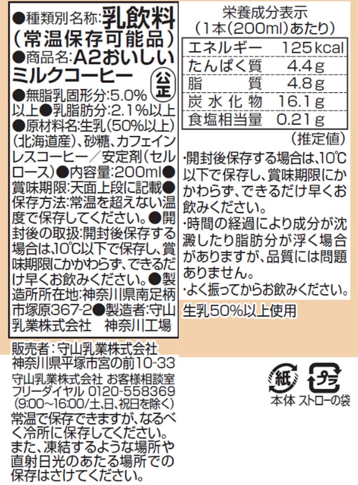 守山乳業 A2おいしいミルクコーヒー 200ml×12本 | 北海道産A2生乳使用。