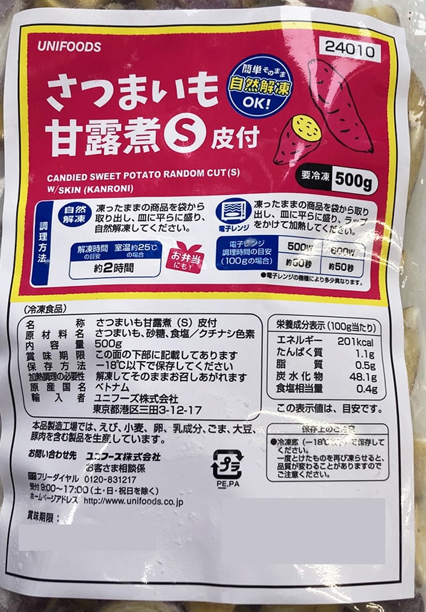 [10個]ユニフーズ 自然解凍OK さつまいも甘露煮 S 皮付 500g | ひとくちサイズ(約6g)の甘露煮をIQF凍結しました。