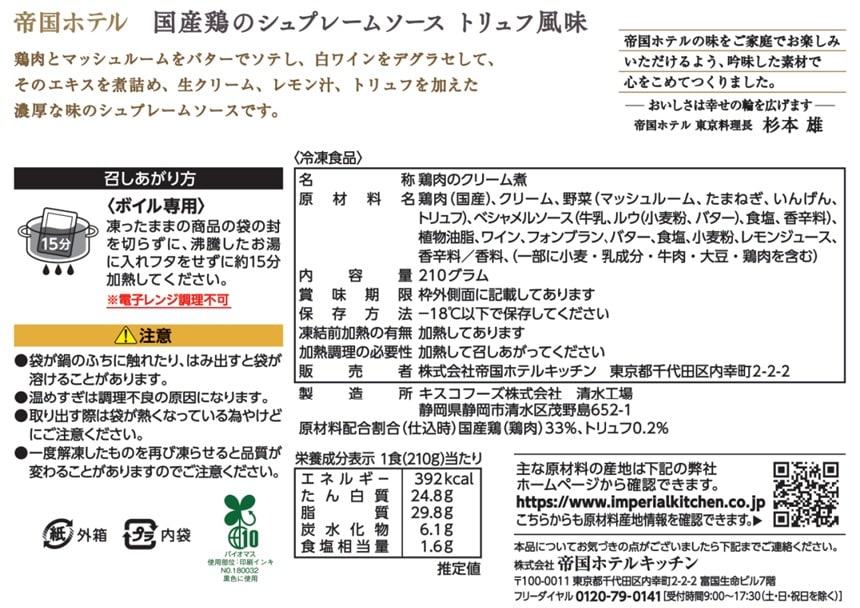 - 帝国ホテル 国産鶏のシュプレームソース トリュフ風味 210...