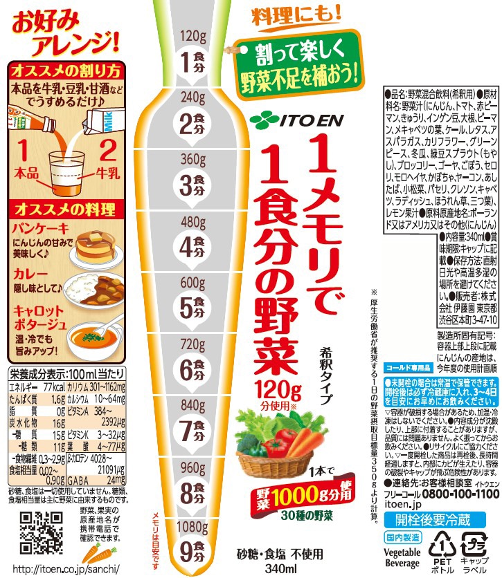 1食分単位の野菜量がはかれ、1本で「1000g分以上」、「9食分」の野菜量を担保しています。にんじんベースのまろやかな味わいでミルクなどで割って飲んでも、料理に使用していただいてもおいしくお召し上がりいただけます。