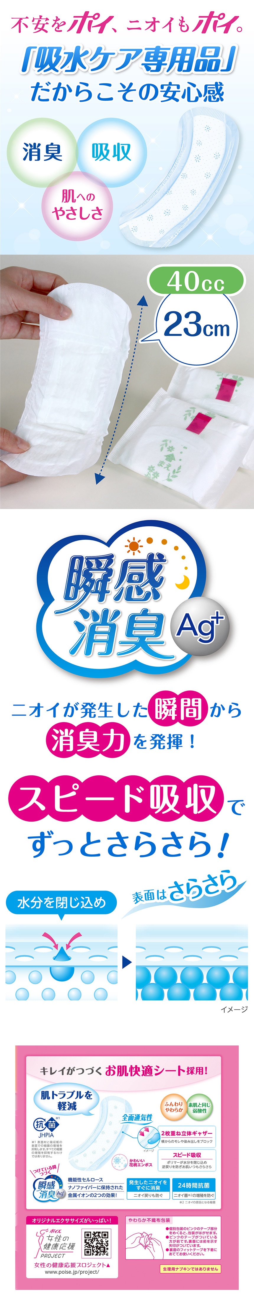 ●「弱酸性・全面通気性シート」に加え、ポイズライナーは「瞬間消臭シート」を採用しているので、ニオイが発生した瞬間から継続的に消臭力を発揮し、ニオイの増殖を防ぎます。