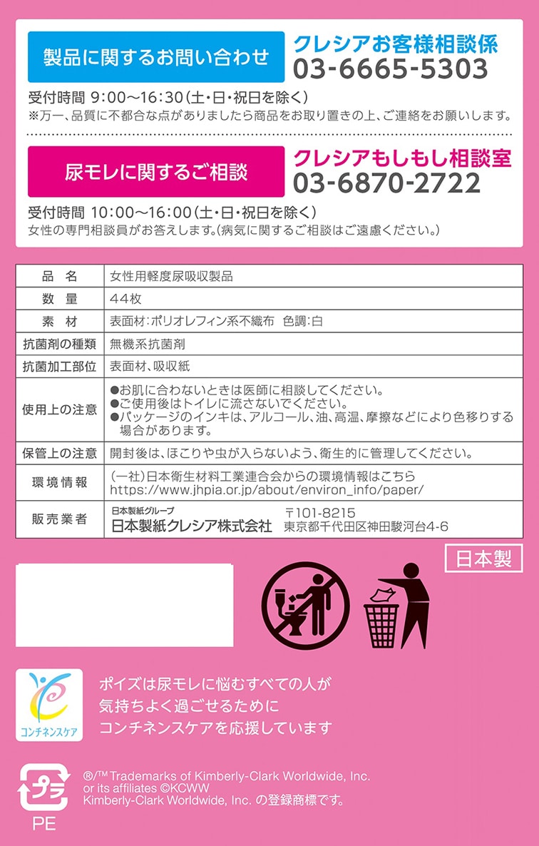 [計264枚]日本製紙クレシア ポイズ さらさら素肌 吸水ナプキン 安心の少量用(吸収量40cc) 44枚入×6個 | しっかり吸水、お肌快適、吸収量40CC。