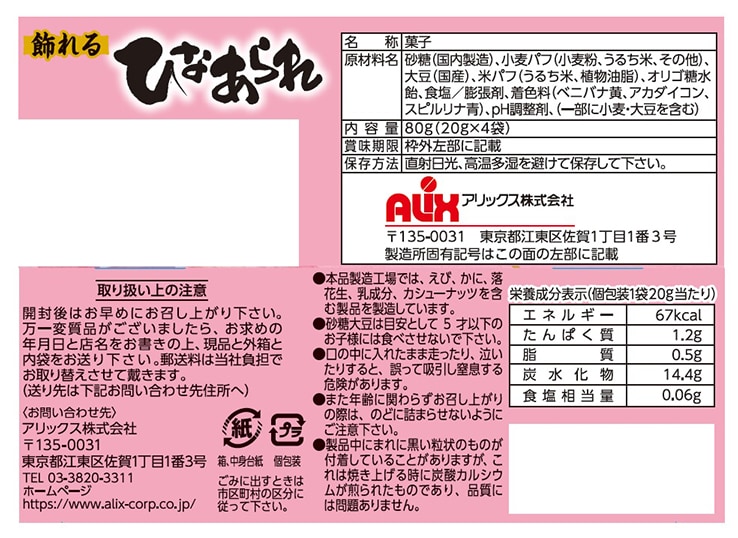 [20個]アリックス 飾れるひなあられ 20g×4袋入 | ひな飾りが作れる台紙入りのひなあられです。