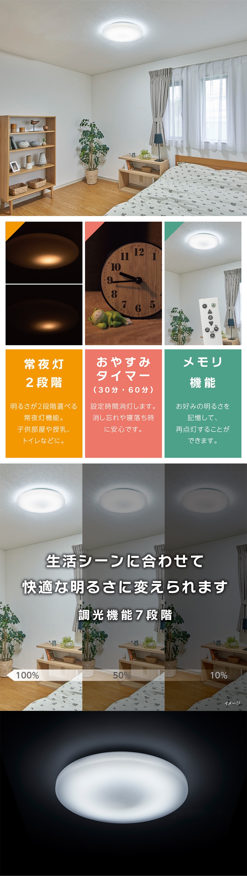 【~8畳/調光7段階】ドウシシャ/LEDシーリングライト(リモコン付)|メモリ機能でお好みの明るさを記憶し再点灯!調光機能7段階で生活シーンに合わせて快適な明るさに変えられる。新生活や引っ越しの際に