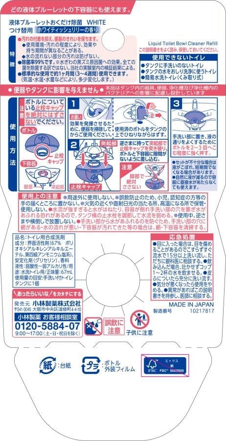 [24個]小林製薬 液体ブルーレット除菌ホワイト つけ替用 ホワイティッシュリリーの香り 67ml