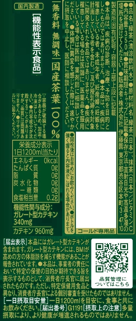 届出表示 :本品にはガレート型カテキンが含まれます。ガレート型カテキンには、BMIが高めの方の体脂肪を減らす機能があることが報告されています。