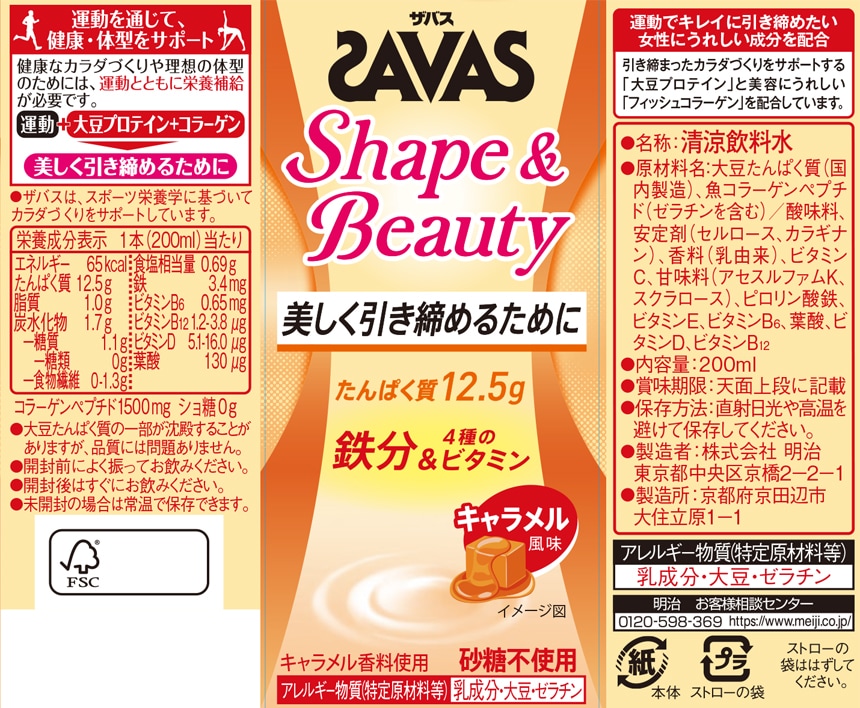 [72本] 明治 ザバス Shape&Beauty キャラメル風味 200ml | 美しく引き締めたいカラダをサポートする、女性のためのプロテイン