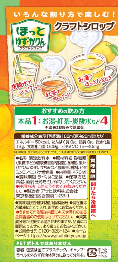 [12本]アサヒ飲料 クラフトシロップ ほっとゆず・かりん(希釈用) プラスチックボトル 470ml | 心も体もほっと温まる、やさしい味わいが楽しめる希釈タイプの飲料