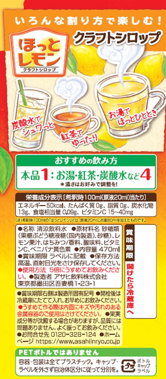 [36本]アサヒ飲料 クラフトシロップ ほっとレモン(希釈用) プラスチックボトル 470ml | レモン果汁にはちみつを加えた、心も体もほっと温まる、やさしい味わいが楽しめる希釈タイプの飲料