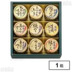 京都九条ねぎ味噌、秋田鳥海山麓ふき、静岡鰹でんぶ、和歌山南高梅かつお、三重磯のり、茨城蓮根柚子風味、鹿児島青さのり、長野柿の木茸、北海道鮭そぼろのセットです。