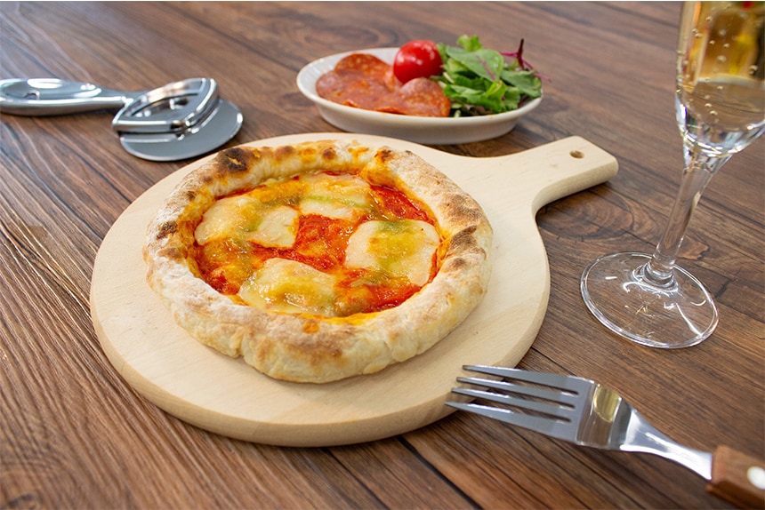 丁寧に手伸ばしした生地を石窯で焼き上げた食べきりサイズののマルゲリータピッツァ。レンジでもっちり食感、トースターでサクッと食感が楽しめます。
