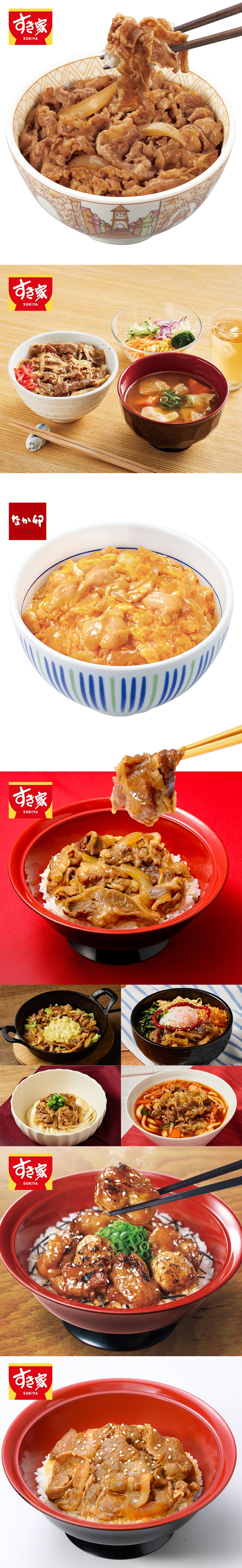- すき家・なか卯 丼の具セット(牛丼 / 豚生姜焼き丼 / 炭火やきとり丼 / 牛カルビ丼 / 親子丼)