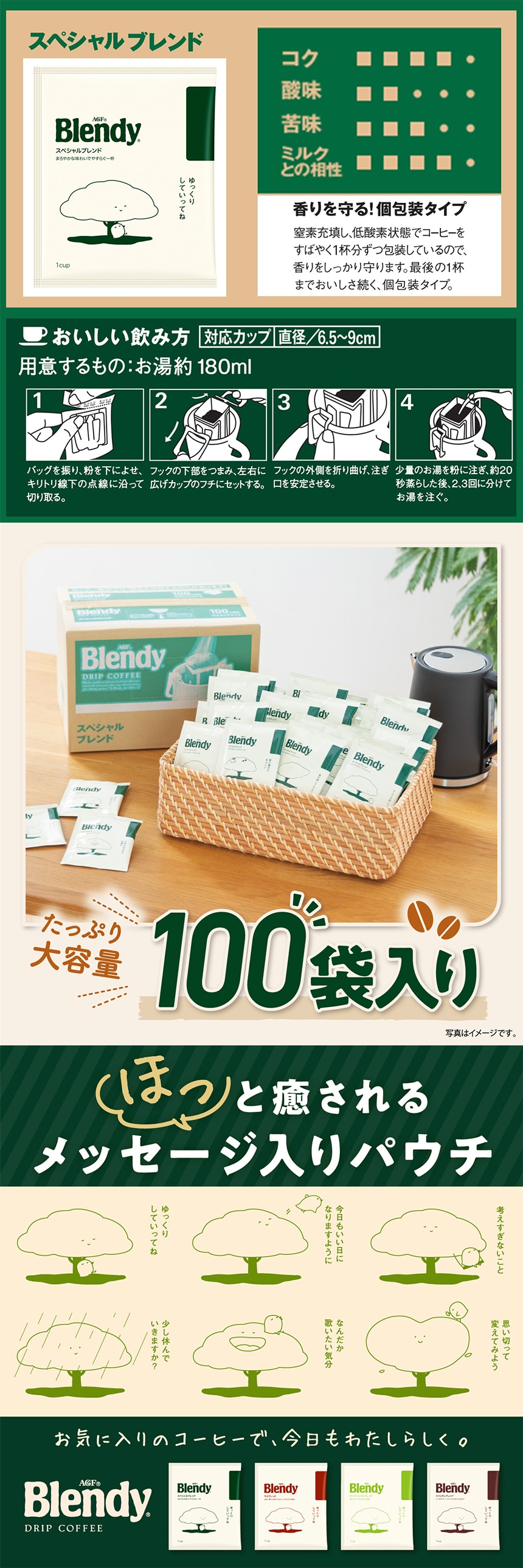 AGF(エージーエフ) 「ブレンディ」 レギュラー・コーヒー ドリップパック スペシャル・ブレンド100袋は、バランスのよい、まろやかな香りとコクが、最後のひとくちまで続きます。