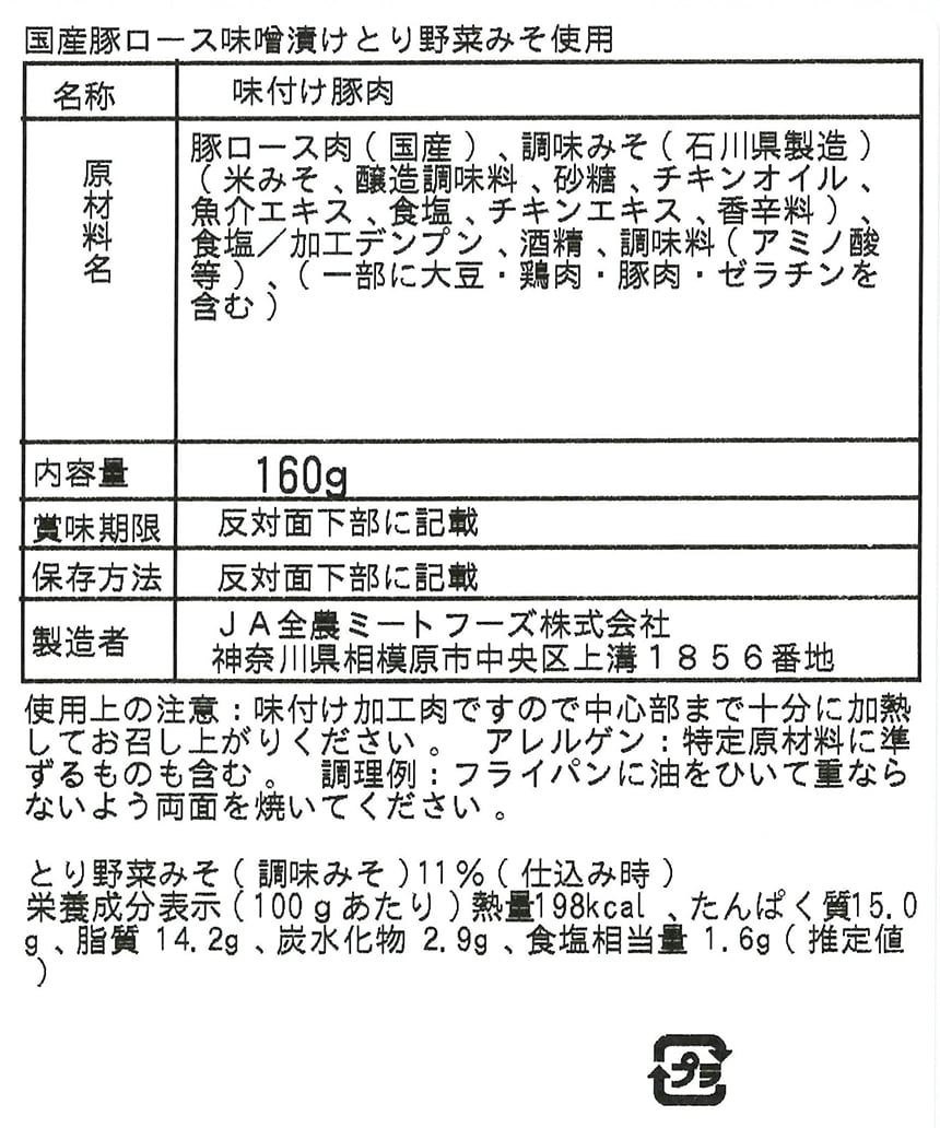 - 国産豚ロース味噌漬け とり野菜味噌使用 160g