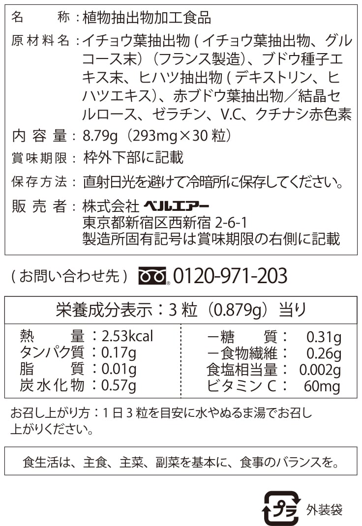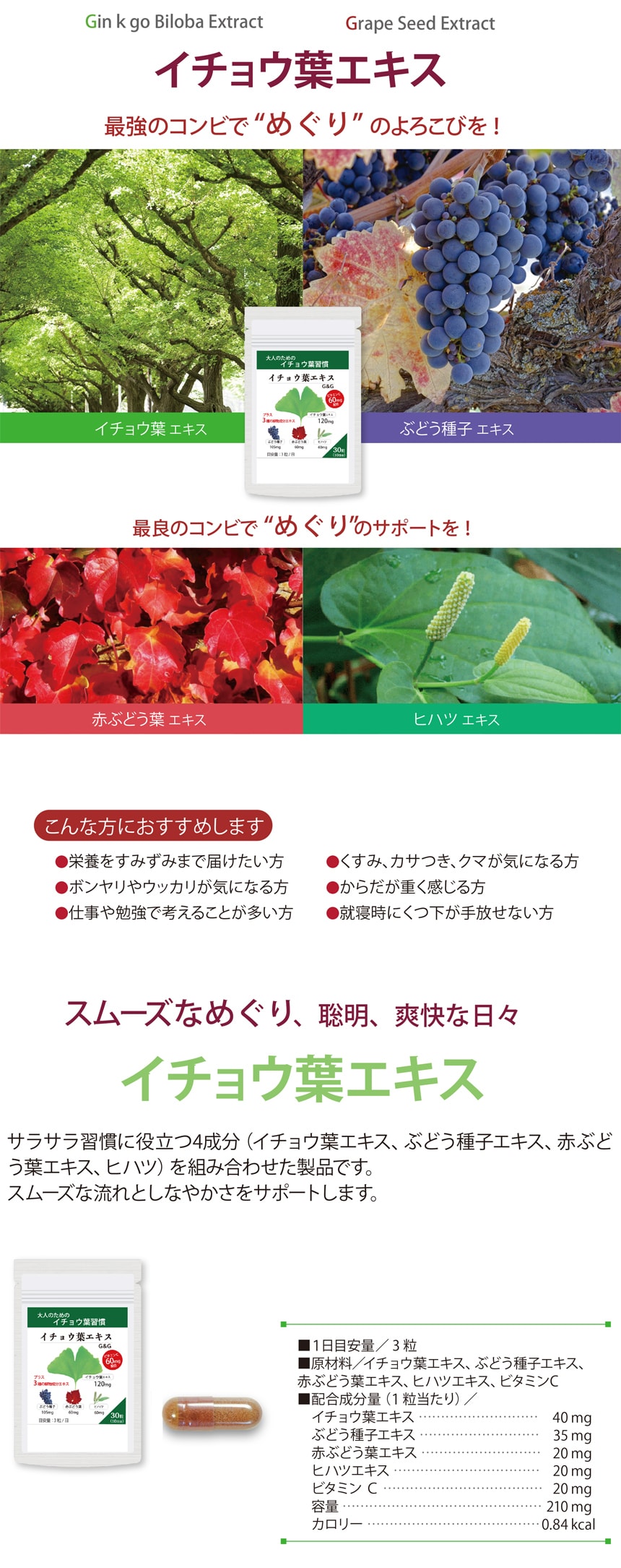 イチョウ葉エキスをメインにプラス3つの植物成分(ぶどう種子エキス、赤ぶどう葉エキス、ヒハツエキス)とビタミンCをバランスよく配合。