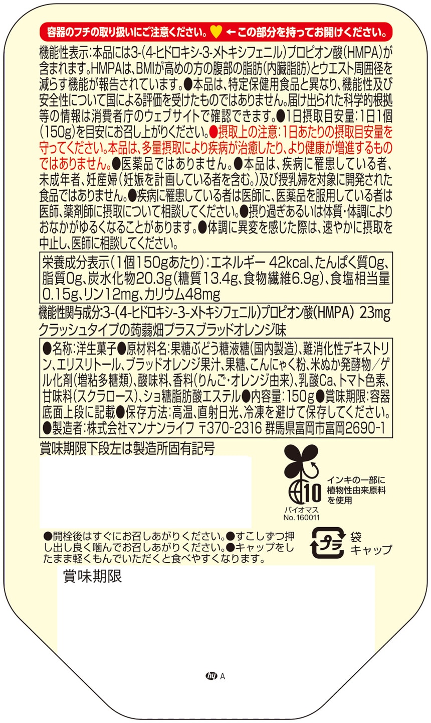 [30個]マンナンライフ クラッシュタイプの蒟蒻畑プラス ブラッドオレンジ味 150g | おいしくて おなかも キレイ